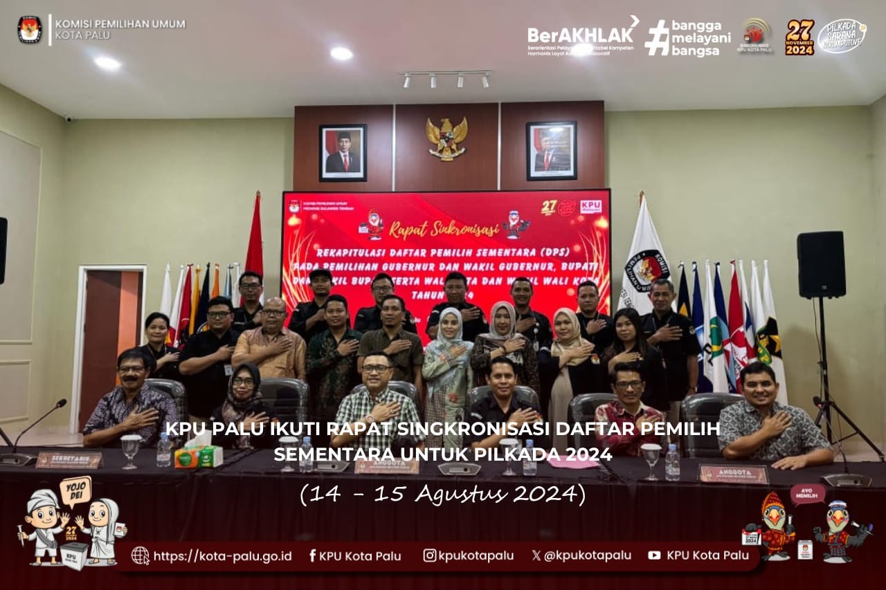 Palu, kota-palu.kpu.go.id - Komisi Pemilihan Umum (KPU) Kota Palu baru-baru ini mengikuti kegiatan Rapat Sinkronisasi Daftar Pemilih Sementara (DPS) yang diadakan oleh KPU Provinsi Sulawesi Tengah. Acara ini dilaksanakan pada 14 hingga 15 Agustus 2024 di Aula Kantor KPU Provinsi Sulawesi Tengah, Jl. S. Parman No. 58 Palu. Rapat ini merupakan bagian dari upaya menindaklanjuti Peraturan KPU (PKPU) Nomor 7 Tahun 2024 mengenai penyusunan daftar pemilih untuk Pemilihan Gubernur dan Wakil Gubernur, Bupati dan Wakil Bupati, serta Wali Kota dan Wakil Wali Kota Tahun 2024.