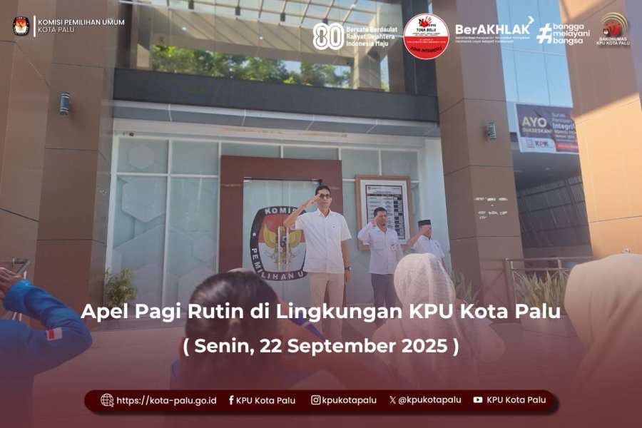 Palu, 22 September 2025 – Komisi Pemilihan Umum (KPU) Kota Palu melaksanakan apel pagi rutin di halaman Kantor KPU Kota Palu, Jl. Balai Kota Selatan No. 6, Senin (22/9/2025). Apel dipimpin langsung oleh Ketua KPU Kota Palu, Idrus, didampingi Anggota KPU Divisi Parmas dan SDM, Alfagih Mugaddam Al-Habsyi, serta Anggota KPU Divisi Hukum dan Pengawasan, Haris Lawisi. Bertindak sebagai Komandan Apel yaitu Arga Budiman, Kepala Sub Bagian Parmas dan SDM. Dalam arahannya, Idrus menyampaikan ucapan selamat datang kepada para mahasiswa magang yang baru bergabung di KPU Kota Palu. Ia juga menekankan pentingnya menjaga kebersihan serta kesiapan ruangan menjelang kunjungan eksternal pada 25 September 2025 mendatang. “Selamat datang kepada mahasiswa magang, selamat datang di KPU Kota Palu. Pada tanggal 25 nanti kita akan kedatangan tamu eksternal dari partai politik dan beberapa lembaga, untuk itu mari kita mempersiapkan baik dari kebersihan maupun kesiapan ruangan yang akan digunakan,” ujar Idrus. Selain itu, ia menekankan pentingnya kedisiplinan, kerja sama, serta membangun kepercayaan dalam melaksanakan tugas sehari-hari. Apel pagi rutin ini diikuti oleh seluruh staf KPU Kota Palu dan mahasiswa magang. [Humas KPU Kota Palu, cml/ft fadel/ed Iz]